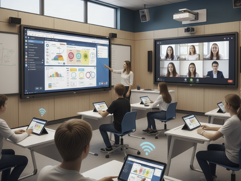- Software de colaboración interactiva: Herramientas que permitan a los alumnos proyectar sus pantallas, realizar encuestas en vivo o participar en pizarras blancas compartidas en la nube.