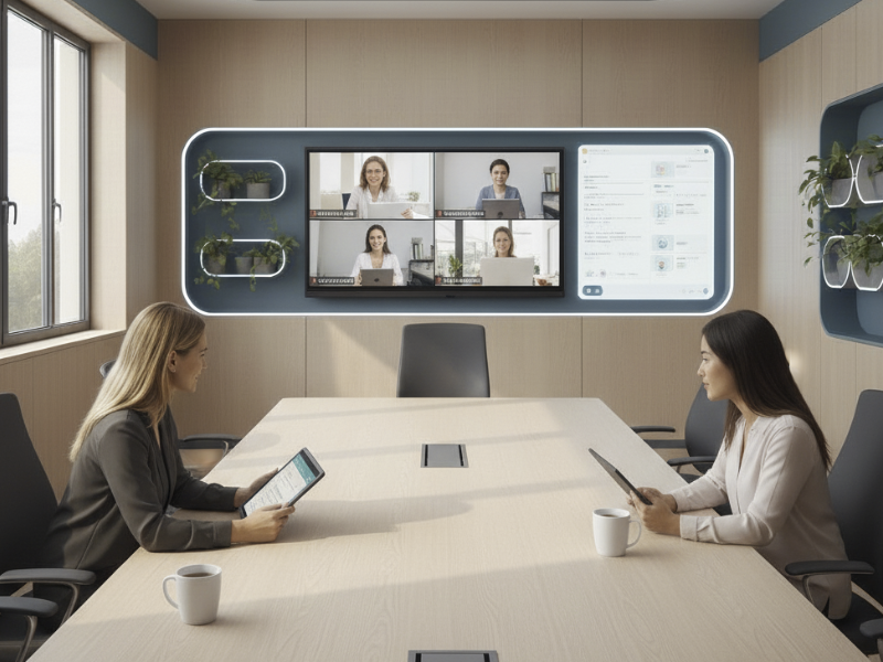 Para que un espacio sea considerado realmente multimedia, debe integrar hardware que facilite la colaboración. No se trata solo de poner una pantalla, sino de crear un ecosistema funcional:
